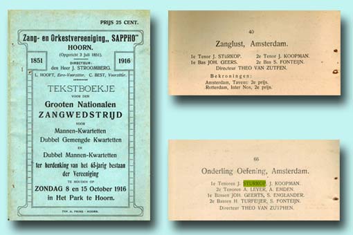 -47- Zangwedstrijd. Jacob Sturkop nam op 8 en 15 oktober 1916 deel aan de Grooten Nationalen Zangwedstrijd in Het Park te Hoorn. Als Eerste Tenor bij Zanglust uit Amsterdam en als een der beide Eerste Tenoren bij Onderling Oefening uit Amsterdam. See Book ‘Genealogie Sturkop & Sturhoofd’ – Volume III – Chapter 17.